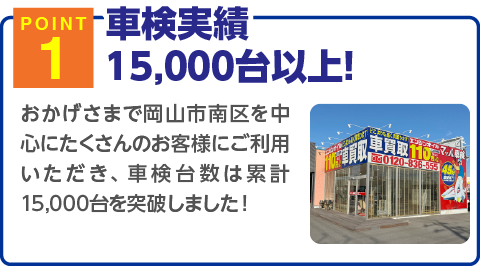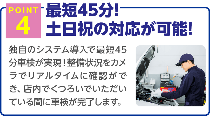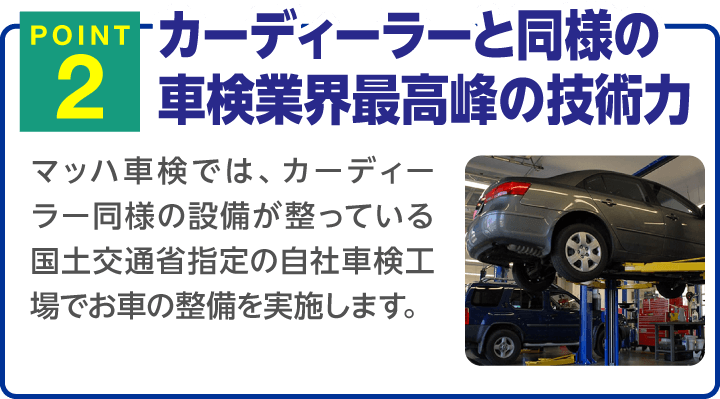 国家資格整備士が、車検に合格するために必要な点検・調整作業をお客様の立会いのもと行います。不具合箇所につきましてはご一緒にご確認しながら丁寧にご説明させていただきます。